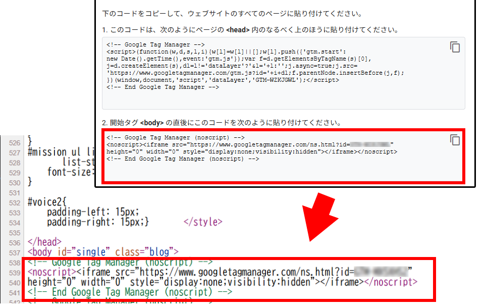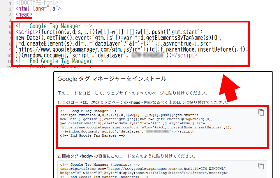 作成直後に表示されるコードをコピーし、以下のようにHTMLに貼り付けます。