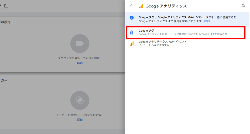 2. 「タグの設定」→「Google アナリティクス」→「Google タグ」を選択